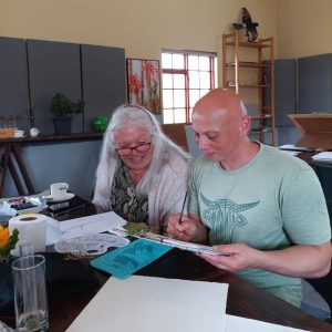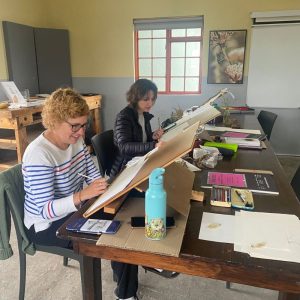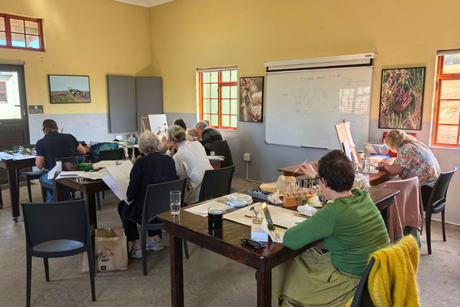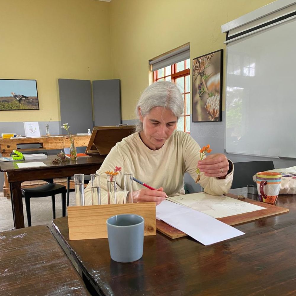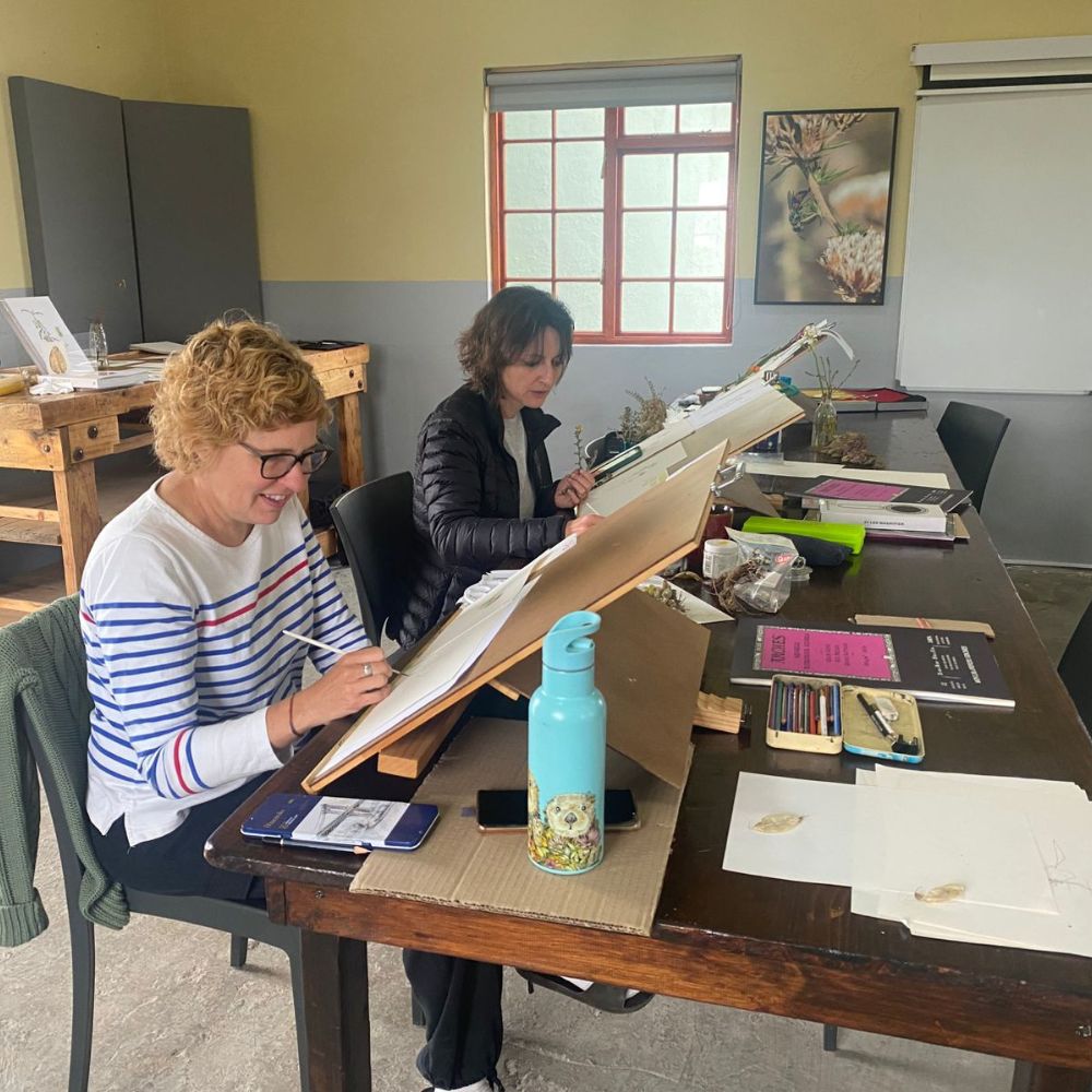 Participants spent the first afternoon selecting a plant from the Haarwegskloof Reserve to illustrate, followed by immersing themselves in hours of focused, supported creativity under Willie’s expert guidance. Delicious meals by the talented Dee Robinson of Tuck Tuck ZA provided a moment’s break from the artistic sessions, adding a warm, homely touch to the weekend.